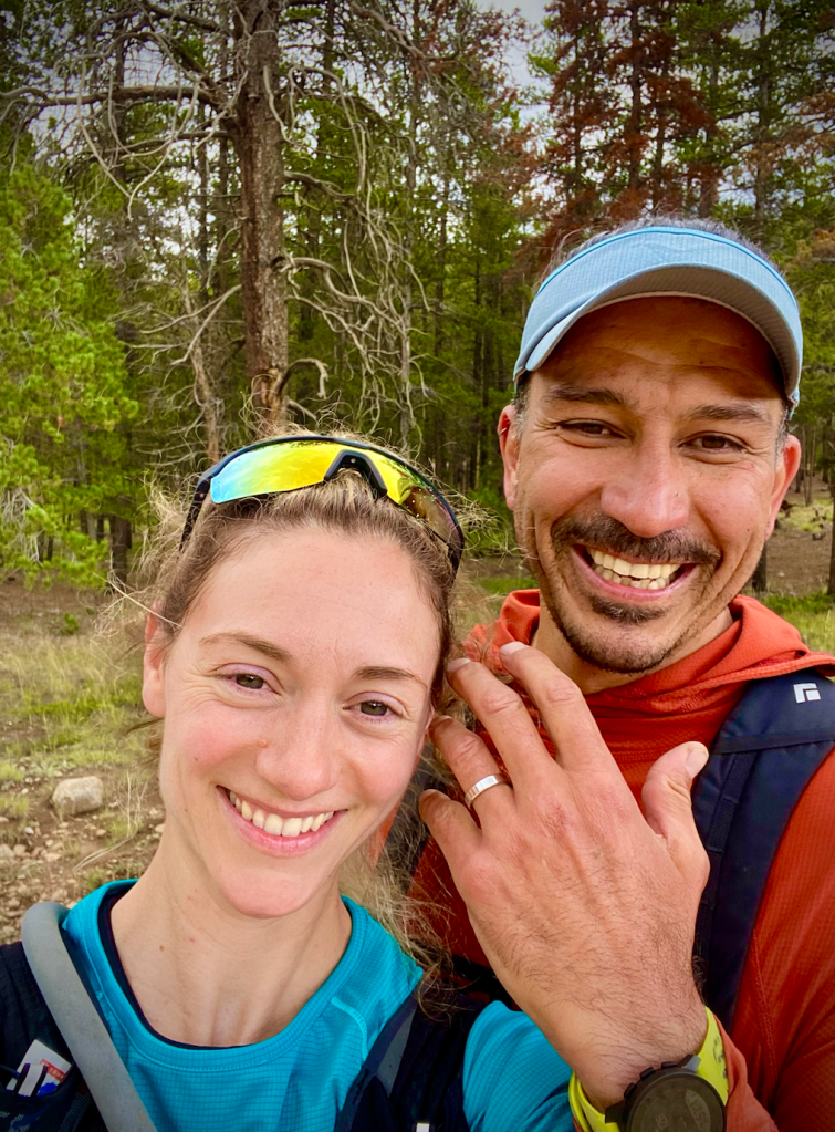 A few bites of food and sips of water later, I recognized the truth: I was underfueled, 21 miles in, and exhausted. I apologized. He understood, hugged me and we settled into a gentle 17-minute pace together. As we moved, I remembered the ring tucked in my pocket. I had been waiting for the right moment to propose back to him. An enormous heart-shaped rock propped against a tree caught my eye. It was now or never. “Hey, honey! Look at this rock!” I called. He turned, curious, and as he studied it, I dropped to one knee. When he spun back around, I looked up at him: “¿Quieres?”—the same word he had asked me nine months earlier.
